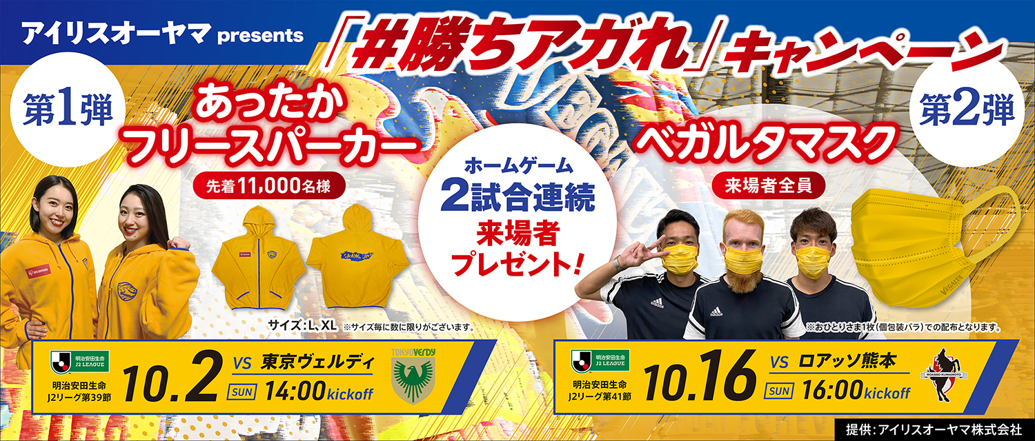 2022明治安田生命J2リーグの10月2日(日) 第39節 東京ヴェルディ戦、10月16日(日) 第41節 ロアッソ熊本戦を対象に、「#勝ちアガれ」キャンペーンを実施いたします。アイリスオーヤマ株式会社さまの特別協賛のもと、対象試合にご来場いただいたみなさまに、同社製のベガルタゴールドグッズをプレゼントいたします。勝ちアガるために、ベガルタゴールドを身に付けてチームを後押ししましょう!