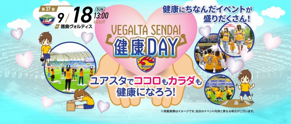 9月18日(日)開催、明治安田生命J2リーグ 第37節 徳島ヴォルティス戦にて、ベガルタ仙台健康DAYを実施します。健康にちなんだイベントや出店ブースが盛りだくさんとなっております。みなさまのご来場をお待ちしております。