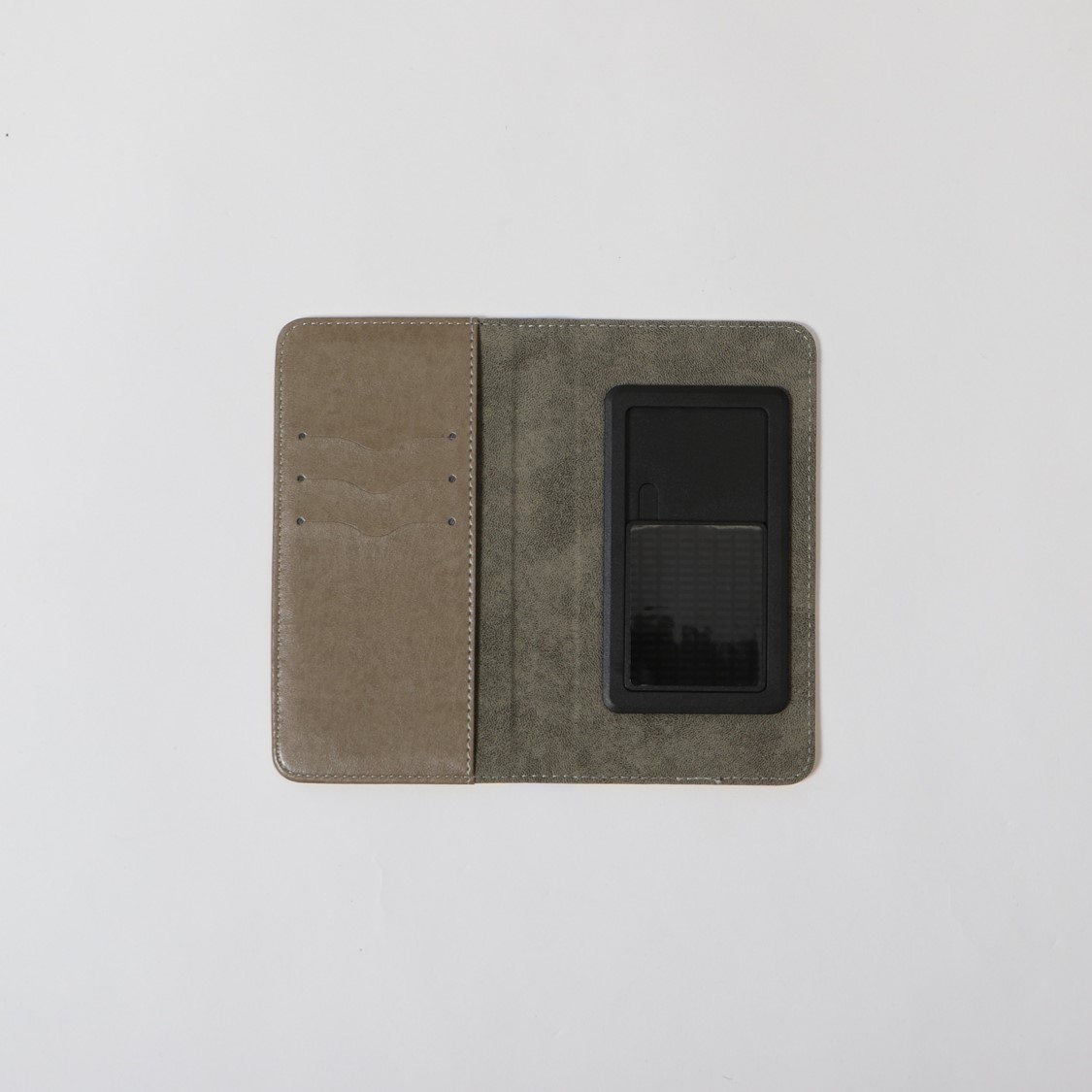 全選手対応の手帳型スマートフォンケース。スライド式粘着パッドにスマートフォン本体を貼り付けるタイプのケースになります。