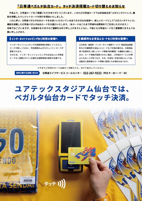 「日専連ベガルタ仙台カード」タッチ決済搭載カード切り替えのお知らせ