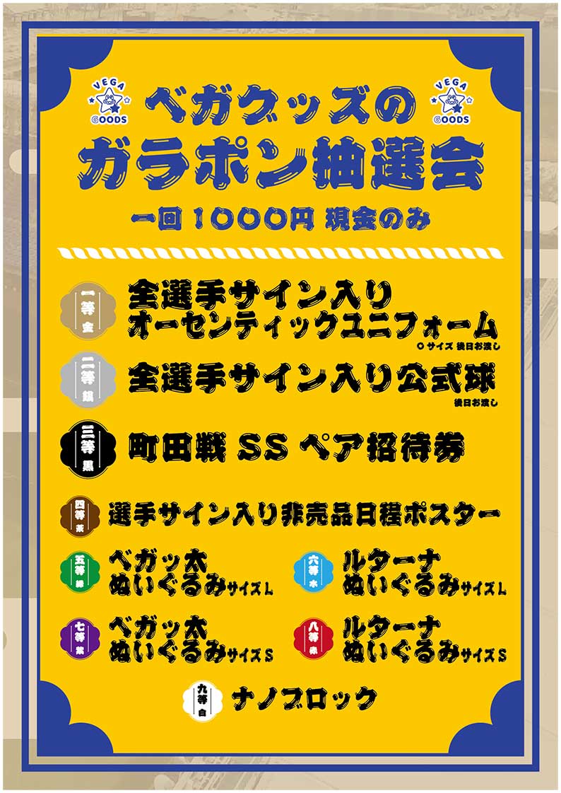 ベガグッズではFAN FUN FESTAに引き続き、ベガルタ仙台誕生祭でもイベントを開催。豪華賞品が当たる!ガラポン抽選会を行います。併せてセールも開催、欲しかった商品がお買い得になっているかも、ぜひベガグッズ売店にお越しください。