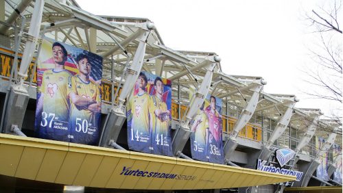 昨シーズンも好評いただきましたユアスタビッグバナーが今年も登場!北エントランスのゲート上に注目。