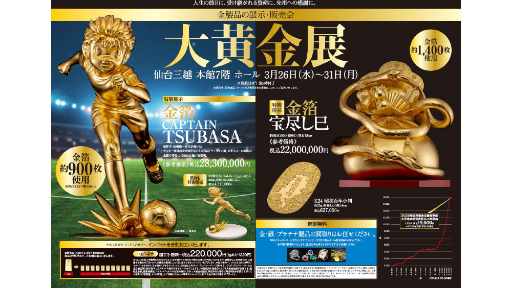 人気の仏具から縁起物まで金製品が一堂に会する展示販売会。人間国宝の作品など日本の伝統の技を施した数々の名品が集うほか、SGCさまとベガルタ仙台の純金コラボ商品各種の展示販売も行います。