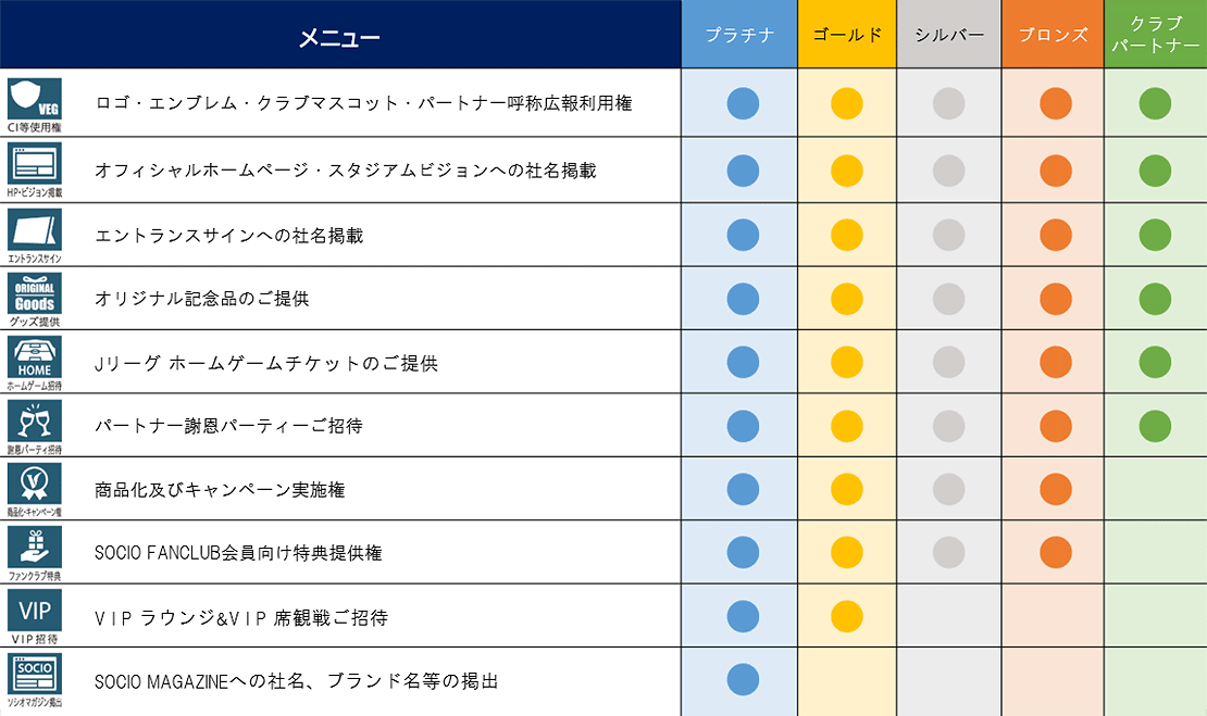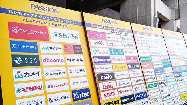 ブロンズパートナー以上の協賛でベガルタ仙台のロゴ、エンブレム、チーム名、マスコットなどを活用した商品化や、当クラブとタイアップしたキャンペーンを実施いただけます。