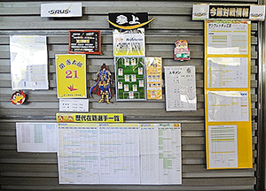 当日のスタメン(スタメン発表後)はもちろんのこと、当日の対戦相手との過去の対戦記録や歴代在籍選手など、壁いっぱいに各種情報を掲示しています。